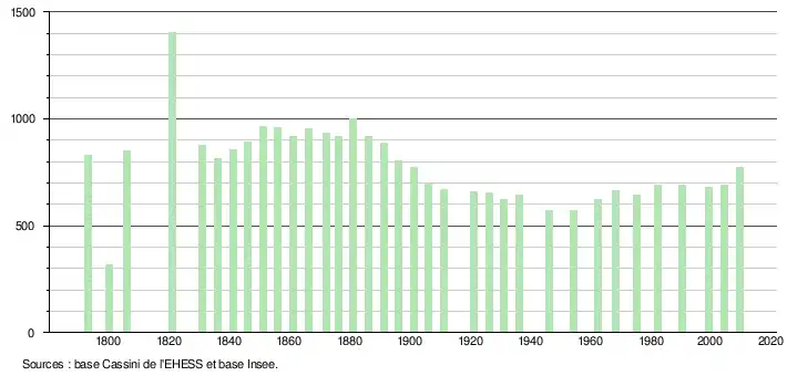L'évolution du nombre d'habitants est connue à travers les recensements de la population effectués dans la commune depuis 1793. À partir du , les populations légales des communes sont publiées annuellement dans le cadre d'un recensement qui repose désormais sur une collecte d'information annuelle, concernant successivement tous les territoires communaux au cours d'une période de cinq ans. Pour les communes de moins de 10 000 habitants, une enquête de recensement portant sur toute la population est réalisée tous les cinq ans, les populations légales des années intermédiaires étant quant à elles estimées par interpolation ou extrapolation[12]. Pour la commune, le premier recensement exhaustif entrant dans le cadre du nouveau dispositif a été réalisé en 2004[13],[Note 1].