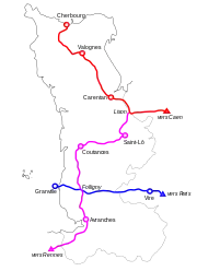 À la suite de l'électrification de la section ferroviaire entre Lison et Saint-Lô durant l'année 2006, la SNCF et les collectivités locales ont expérimenté une liaison Intercités directe (sans changement de train) jusqu'à Paris (gare Saint-Lazare) pendant deux ans (entre et ). Cette expérience n'a pas été pérennisée faute d'un nombre suffisant de voyageurs[23]. On compte également l'ancienne ligne à usage industriel (désaffectée) vers Condé-sur-Vire. La section entre Gourfaleur et Condé-sur-Vire[24], jouxtant le chemin du halage longeant la Vire, est utilisée par le vélorail de la vallée de la Vire depuis 2007.