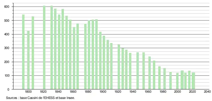 | L'évolution du nombre d'habitants est connue à travers les recensements de la population effectués dans la commune depuis 1793. Pour les communes de moins de 10 000 habitants, une enquête de recensement portant sur toute la population est réalisée tous les cinq ans, les populations légales des années intermédiaires étant quant à elles estimées par interpolation ou extrapolation[25]. Pour la commune, le premier recensement exhaustif entrant dans le cadre du nouveau dispositif a été réalisé en 2005[26]. En 2021, la commune comptait 122 habitants[Note 3], en diminution de 9,63 % par rapport à 2015 (Hautes-Pyrénées : +1,04 %, France hors Mayotte : +1,84 %). |