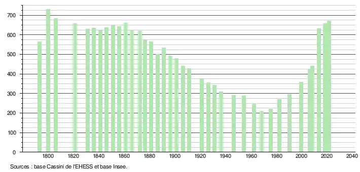 L'évolution du nombre d'habitants est connue à travers les recensements de la population effectués dans la commune depuis 1793. Pour les communes de moins de 10 000 habitants, une enquête de recensement portant sur toute la population est réalisée tous les cinq ans, les populations légales des années intermédiaires étant quant à elles estimées par interpolation ou extrapolation[22]. Pour la commune, le premier recensement exhaustif entrant dans le cadre du nouveau dispositif a été réalisé en 2008[23].