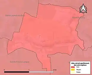 Le retrait-gonflement des sols argileux est susceptible d'engendrer des dommages importants aux bâtiments en cas d’alternance de périodes de sécheresse et de pluie. La totalité de la commune est en aléa moyen ou fort (67,4 % au niveau départemental et 48,5 % au niveau national). Sur les 48 bâtiments dénombrés sur la commune en 2019, 48 sont en aléa moyen ou fort, soit 100 %, à comparer aux 84 % au niveau départemental et 54 % au niveau national. Une cartographie de l'exposition du territoire national au retrait gonflement des sols argileux est disponible sur le site du BRGM[17],[Carte 2].