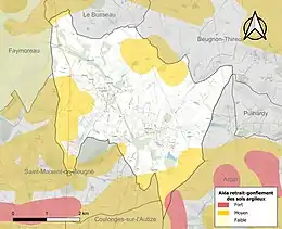 Les mouvements de terrains susceptibles de se produire sur la commune sont des mouvements de terrains, notamment des tassements différentiels[18]. Le retrait-gonflement des sols argileux est susceptible d'engendrer des dommages importants aux bâtiments en cas d’alternance de périodes de sécheresse et de pluie[19]. 26,8 % de la superficie communale est en aléa moyen ou fort (54,9 % au niveau départemental et 48,5 % au niveau national)[Carte 2]. Depuis le , en application de la loi ELAN, différentes contraintes s'imposent aux vendeurs, maîtres d'ouvrages ou constructeurs de biens situés dans une zone classée en aléa moyen ou fort[Note 3],[20].