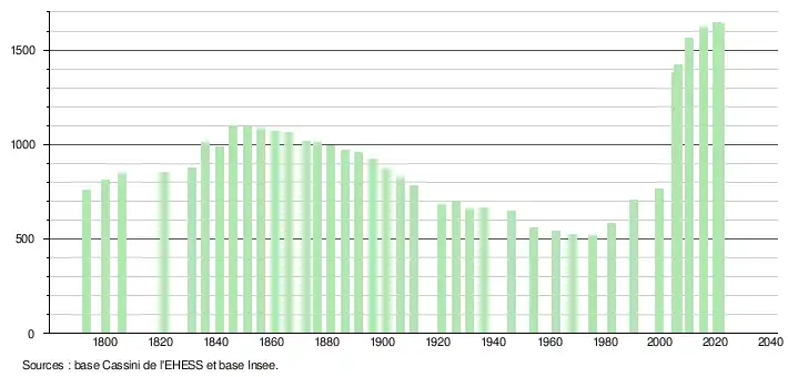 L'évolution du nombre d'habitants est connue à travers les recensements de la population effectués dans la commune depuis 1793. Pour les communes de moins de 10 000 habitants, une enquête de recensement portant sur toute la population est réalisée tous les cinq ans, les populations légales des années intermédiaires étant quant à elles estimées par interpolation ou extrapolation[20]. Pour la commune, le premier recensement exhaustif entrant dans le cadre du nouveau dispositif a été réalisé en 2005[21].