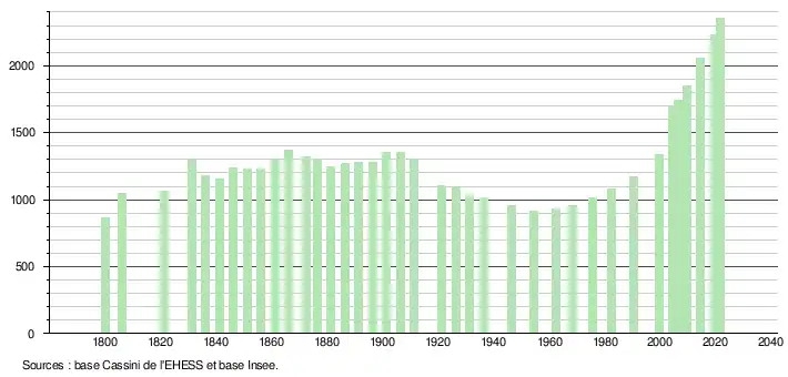 L'évolution du nombre d'habitants est connue à travers les recensements de la population effectués dans la commune depuis 1800. Pour les communes de moins de 10 000 habitants, une enquête de recensement portant sur toute la population est réalisée tous les cinq ans, les populations légales des années intermédiaires étant quant à elles estimées par interpolation ou extrapolation[32]. Pour la commune, le premier recensement exhaustif entrant dans le cadre du nouveau dispositif a été réalisé en 2004[33].