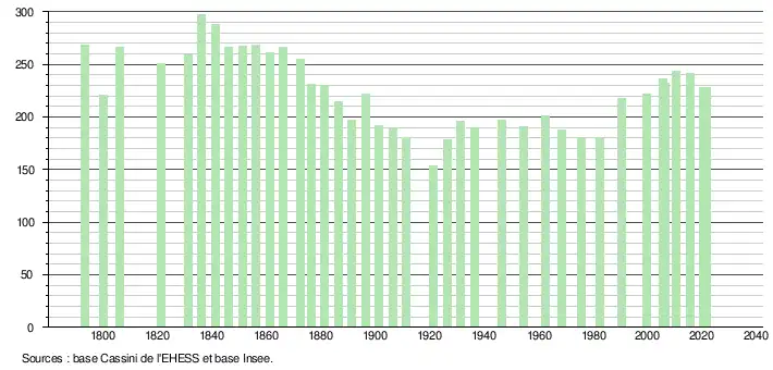 L'évolution du nombre d'habitants est connue à travers les recensements de la population effectués dans la commune depuis 1793. Pour les communes de moins de 10 000 habitants, une enquête de recensement portant sur toute la population est réalisée tous les cinq ans, les populations légales des années intermédiaires étant quant à elles estimées par interpolation ou extrapolation[15]. Pour la commune, le premier recensement exhaustif entrant dans le cadre du nouveau dispositif a été réalisé en 2005[16].