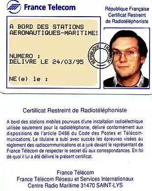 - Le certificat restreint de radiotéléphoniste du service mobile aéronautique-maritime (depuis les aéronefs en vol au-dessus des océans), depuis les hydravions ou (sur les navires équipés d’une station radioélectrique sur 121,500 MHz et 123,1 MHz [13] ).