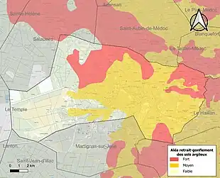 Le retrait-gonflement des sols argileux est susceptible d'engendrer des dommages importants aux bâtiments en cas d’alternance de périodes de sécheresse et de pluie. 63,4 % de la superficie communale est en aléa moyen ou fort (67,4 % au niveau départemental et 48,5 % au niveau national). Sur les 10 672 bâtiments dénombrés sur la commune en 2019, 10 652 sont en aléa moyen ou fort, soit 100 %, à comparer aux 84 % au niveau départemental et 54 % au niveau national. Une cartographie de l'exposition du territoire national au retrait gonflement des sols argileux est disponible sur le site du BRGM[27],[Carte 2].