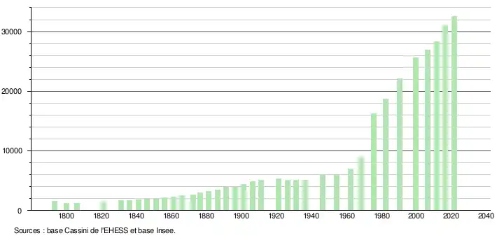- Par convention dans Wikipédia, le principe a été retenu de n’afficher dans le tableau des recensements et le graphique, pour les populations légales postérieures à 1999, que les populations correspondant à une enquête exhaustive de recensement pour les communes de moins de 10 000 habitants, et que les populations des années 2006, 2011, 2016, etc. pour les communes de plus de 10 000 habitants, ainsi que la dernière population légale publiée par l’Insee pour l'ensemble des communes.