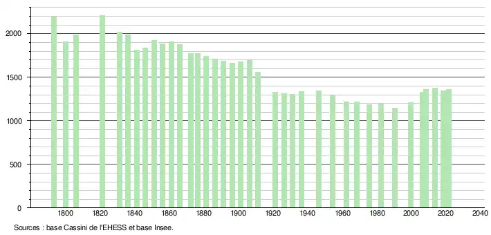 L'évolution du nombre d'habitants est connue à travers les recensements de la population effectués dans la commune depuis 1793. Pour les communes de moins de 10 000 habitants, une enquête de recensement portant sur toute la population est réalisée tous les cinq ans, les populations légales des années intermédiaires étant quant à elles estimées par interpolation ou extrapolation[26]. Pour la commune, le premier recensement exhaustif entrant dans le cadre du nouveau dispositif a été réalisé en 2008[27].