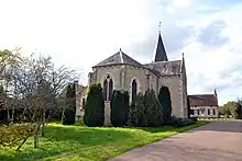 - Église composée d'un chœur moderne, d'une nef à fenêtres gothiques du XVIe siècle et d'un clocher-porche également moderne[27].