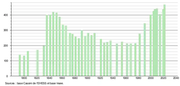 L'évolution du nombre d'habitants est connue à travers les recensements de la population effectués dans la commune depuis 1793. Pour les communes de moins de 10 000 habitants, une enquête de recensement portant sur toute la population est réalisée tous les cinq ans, les populations légales des années intermédiaires étant quant à elles estimées par interpolation ou extrapolation[30]. Pour la commune, le premier recensement exhaustif entrant dans le cadre du nouveau dispositif a été réalisé en 2004[31].