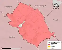Le retrait-gonflement des sols argileux est susceptible d'engendrer des dommages importants aux bâtiments en cas d’alternance de périodes de sécheresse et de pluie. 98,7 % de la superficie communale est en aléa moyen ou fort (88,8 % au niveau départemental et 48,5 % au niveau national). Sur les 183 bâtiments dénombrés sur la commune en 2019, 183 sont en aléa moyen ou fort, soit 100 %, à comparer aux 98 % au niveau départemental et 54 % au niveau national. Une cartographie de l'exposition du territoire national au retrait gonflement des sols argileux est disponible sur le site du BRGM[26],[Carte 3].
