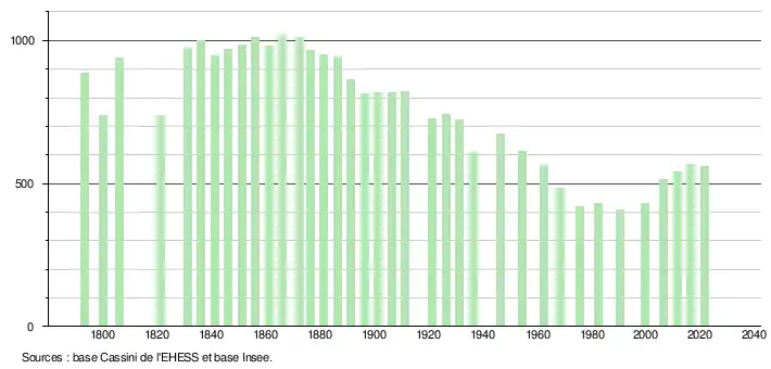 L'évolution du nombre d'habitants est connue à travers les recensements de la population effectués dans la commune depuis 1793. Pour les communes de moins de 10 000 habitants, une enquête de recensement portant sur toute la population est réalisée tous les cinq ans, les populations légales des années intermédiaires étant quant à elles estimées par interpolation ou extrapolation[21]. Pour la commune, le premier recensement exhaustif entrant dans le cadre du nouveau dispositif a été réalisé en 2006[22].