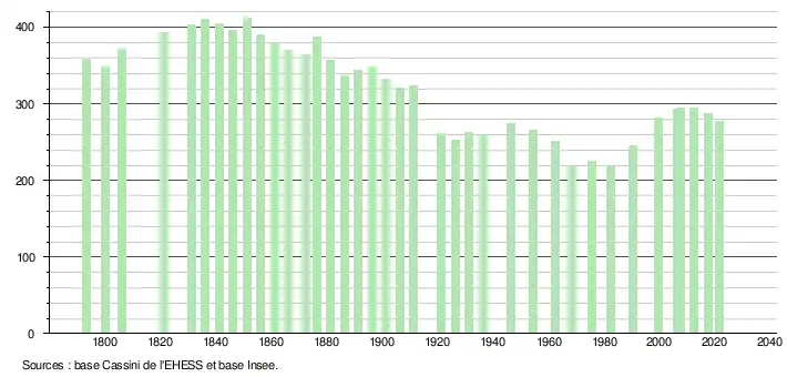 L'évolution du nombre d'habitants est connue à travers les recensements de la population effectués dans la commune depuis 1793. Pour les communes de moins de 10 000 habitants, une enquête de recensement portant sur toute la population est réalisée tous les cinq ans, les populations légales des années intermédiaires étant quant à elles estimées par interpolation ou extrapolation[37]. Pour la commune, le premier recensement exhaustif entrant dans le cadre du nouveau dispositif a été réalisé en 2007[38].