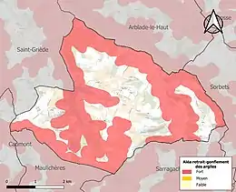 Le retrait-gonflement des sols argileux est susceptible d'engendrer des dommages importants aux bâtiments en cas d’alternance de périodes de sécheresse et de pluie. 59,5 % de la superficie communale est en aléa moyen ou fort (94,5 % au niveau départemental et 48,5 % au niveau national). Sur les 104 bâtiments dénombrés sur la commune en 2019, 25 sont en aléa moyen ou fort, soit 24 %, à comparer aux 93 % au niveau départemental et 54 % au niveau national. Une cartographie de l'exposition du territoire national au retrait gonflement des sols argileux est disponible sur le site du BRGM[19],[Carte 3].