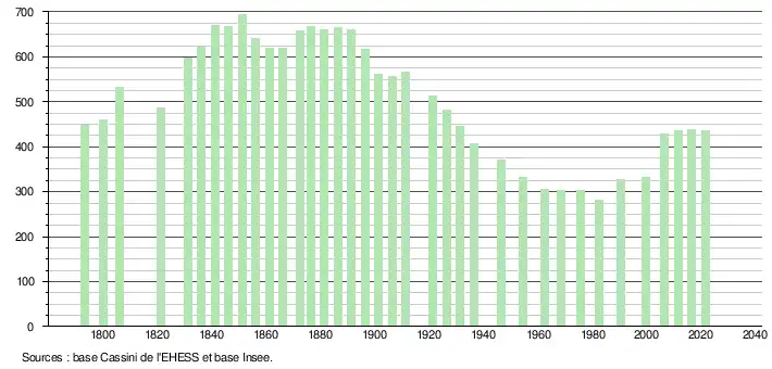 L'évolution du nombre d'habitants est connue à travers les recensements de la population effectués dans la commune depuis 1793. Pour les communes de moins de 10 000 habitants, une enquête de recensement portant sur toute la population est réalisée tous les cinq ans, les populations légales des années intermédiaires étant quant à elles estimées par interpolation ou extrapolation[16]. Pour la commune, le premier recensement exhaustif entrant dans le cadre du nouveau dispositif a été réalisé en 2006[17].