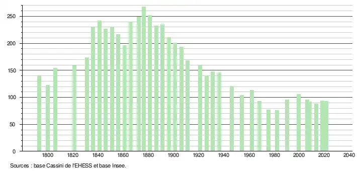 L'évolution du nombre d'habitants est connue à travers les recensements de la population effectués dans la commune depuis 1793. Pour les communes de moins de 10 000 habitants, une enquête de recensement portant sur toute la population est réalisée tous les cinq ans, les populations légales des années intermédiaires étant quant à elles estimées par interpolation ou extrapolation[21]. Pour la commune, le premier recensement exhaustif entrant dans le cadre du nouveau dispositif a été réalisé en 2008[22].