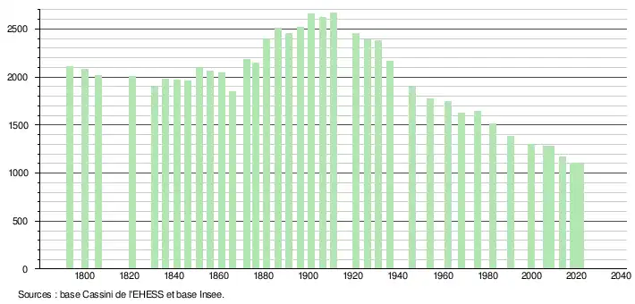 L'évolution du nombre d'habitants est connue à travers les recensements de la population effectués dans la commune depuis 1793. Pour les communes de moins de 10 000 habitants, une enquête de recensement portant sur toute la population est réalisée tous les cinq ans, les populations légales des années intermédiaires étant quant à elles estimées par interpolation ou extrapolation[16]. Pour la commune, le premier recensement exhaustif entrant dans le cadre du nouveau dispositif a été réalisé en 2008[17].
