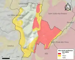 La commune est vulnérable au risque de mouvements de terrains constitué principalement du retrait-gonflement des sols argileux[18]. Cet aléa est susceptible d'engendrer des dommages importants aux bâtiments en cas d’alternance de périodes de sécheresse et de pluie. 62,9 % de la superficie communale est en aléa moyen ou fort (67,5 % au niveau départemental et 48,5 % au niveau national). Sur les 1 386 bâtiments dénombrés sur la commune en 2019, 1295 sont en aléa moyen ou fort, soit 93 %, à comparer aux 90 % au niveau départemental et 54 % au niveau national. Une cartographie de l'exposition du territoire national au retrait gonflement des sols argileux est disponible sur le site du BRGM[19],[Carte 2].