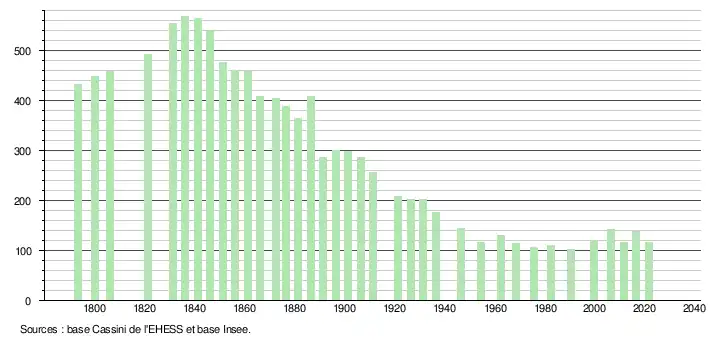L'évolution du nombre d'habitants est connue à travers les recensements de la population effectués dans la commune depuis 1793. Pour les communes de moins de 10 000 habitants, une enquête de recensement portant sur toute la population est réalisée tous les cinq ans, les populations légales des années intermédiaires étant quant à elles estimées par interpolation ou extrapolation[32]. Pour la commune, le premier recensement exhaustif entrant dans le cadre du nouveau dispositif a été réalisé en 2006[33].