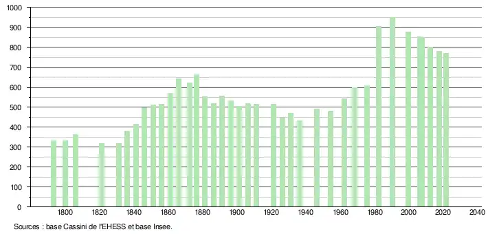 L'évolution du nombre d'habitants est connue à travers les recensements de la population effectués dans la commune depuis 1793. Pour les communes de moins de 10 000 habitants, une enquête de recensement portant sur toute la population est réalisée tous les cinq ans, les populations légales des années intermédiaires étant quant à elles estimées par interpolation ou extrapolation[28]. Pour la commune, le premier recensement exhaustif entrant dans le cadre du nouveau dispositif a été réalisé en 2007[29].
