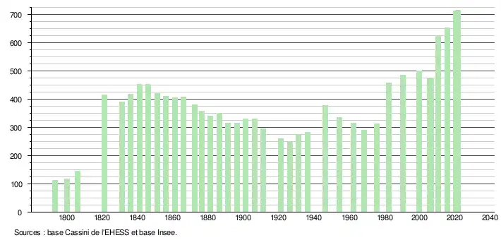 L'évolution du nombre d'habitants est connue à travers les recensements de la population effectués dans la commune depuis 1793. Pour les communes de moins de 10 000 habitants, une enquête de recensement portant sur toute la population est réalisée tous les cinq ans, les populations légales des années intermédiaires étant quant à elles estimées par interpolation ou extrapolation[28]. Pour la commune, le premier recensement exhaustif entrant dans le cadre du nouveau dispositif a été réalisé en 2005[29].