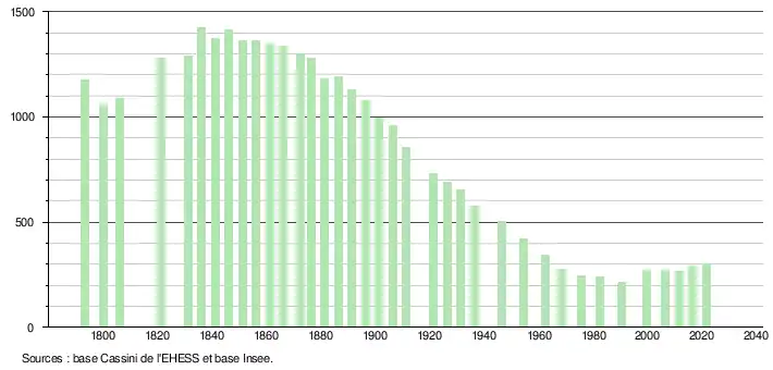 L'évolution du nombre d'habitants est connue à travers les recensements de la population effectués dans la commune depuis 1793. Pour les communes de moins de 10 000 habitants, une enquête de recensement portant sur toute la population est réalisée tous les cinq ans, les populations légales des années intermédiaires étant quant à elles estimées par interpolation ou extrapolation[16]. Pour la commune, le premier recensement exhaustif entrant dans le cadre du nouveau dispositif a été réalisé en 2006[17].