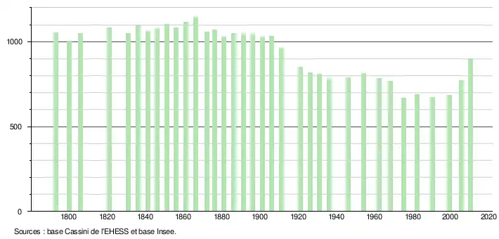 L'évolution du nombre d'habitants est connue à travers les recensements de la population effectués dans la commune depuis 1793. À partir du , les populations légales des communes sont publiées annuellement dans le cadre d'un recensement qui repose désormais sur une collecte d'information annuelle, concernant successivement tous les territoires communaux au cours d'une période de cinq ans. Pour les communes de moins de 10 000 habitants, une enquête de recensement portant sur toute la population est réalisée tous les cinq ans, les populations légales des années intermédiaires étant quant à elles estimées par interpolation ou extrapolation[11]. Pour la commune, le premier recensement exhaustif entrant dans le cadre du nouveau dispositif a été réalisé en 2005[12],[Note 1].