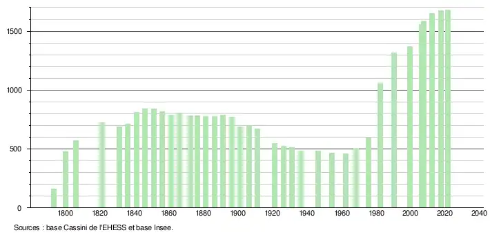 L'évolution du nombre d'habitants est connue à travers les recensements de la population effectués dans la commune depuis 1793. Pour les communes de moins de 10 000 habitants, une enquête de recensement portant sur toute la population est réalisée tous les cinq ans, les populations légales des années intermédiaires étant quant à elles estimées par interpolation ou extrapolation[30]. Pour la commune, le premier recensement exhaustif entrant dans le cadre du nouveau dispositif a été réalisé en 2007[31].