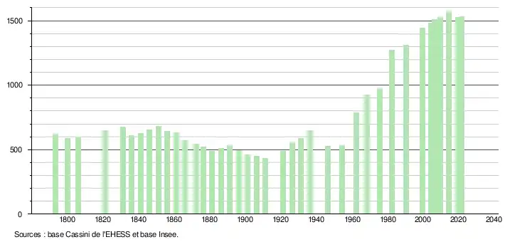 L'évolution du nombre d'habitants est connue à travers les recensements de la population effectués dans la commune depuis 1793. Pour les communes de moins de 10 000 habitants, une enquête de recensement portant sur toute la population est réalisée tous les cinq ans, les populations légales des années intermédiaires étant quant à elles estimées par interpolation ou extrapolation[19]. Pour la commune, le premier recensement exhaustif entrant dans le cadre du nouveau dispositif a été réalisé en 2004[20].