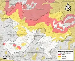 Les mouvements de terrains susceptibles de se produire sur la commune sont des affaissements et effondrements liés aux cavités souterraines (hors mines) et des tassements différentiels[20]. Afin de mieux appréhender le risque d’affaissement de terrain, un inventaire national permet de localiser les éventuelles cavités souterraines sur la commune[21]. Le retrait-gonflement des sols argileux est susceptible d'engendrer des dommages importants aux bâtiments en cas d’alternance de périodes de sécheresse et de pluie[22]. 58,3 % de la superficie communale est en aléa moyen ou fort (79,5 % au niveau départemental et 48,5 % au niveau national)[23]. Depuis le , en application de la loi ÉLAN, différentes contraintes s'imposent aux vendeurs, maîtres d'ouvrages ou constructeurs de biens situés dans une zone classée en aléa moyen ou fort[Note 3],[24].
