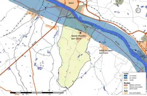 Le cours de la Loire s’insère dans une large vallée qu’elle a façonnée peu à peu depuis des milliers d’années. Elle traverse le sud du département du Loiret depuis Beaulieu-sur-Loire jusqu'à Beaugency, avec un cours large et lent. La Loire présente des fluctuations saisonnières de débit assez marquées[17]. Son débit est régulé par des barrages amont (Naussac en amont sur l’Allier et Villerest). Ces barrages interviennent pour le soutien d’étiage (débit minimum de 60 m3/s en étiage à Gien) et Villerest permet également d’écrêter les crues. La Loire est un cours d’eau domanial classé en deuxième catégorie piscicole. L'espèce biologique dominante est constituée essentiellement de poissons blancs (cyprinidés) et de carnassiers (brochet, sandre et perche). La station hydrométrique la plus proche de la commune et servant de référence en cas de crue est celle de Gien. Le débit mensuel moyen (calculé sur 82 ans pour cette station) varie de 102 m3/s au mois d'août à 593 m3/s au mois de février. La Loire connaît toutefois en cas d'intempéries exceptionnelles des pics de débits très importants, le maximum ayant été atteint sur cette station le avec 3 320 m3/s et une hauteur de 5,03 m[18],[19]. Le débit maximum de la Loire ayant été atteint lors des crues de 1856 ou 1866 avec une valeur de l'ordre de 7 000 m3/s, la hauteur maximale ayant été atteinte le avec 7,19 m[20].