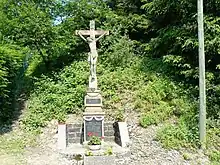 Une autre croix, la première à droite de l'entrée du cimetière, se dresse sur la tombe des parents du curé Mantz. En grès rose, elle a été érigée en 1824, c'est un beau témoin de l'art populaire.
