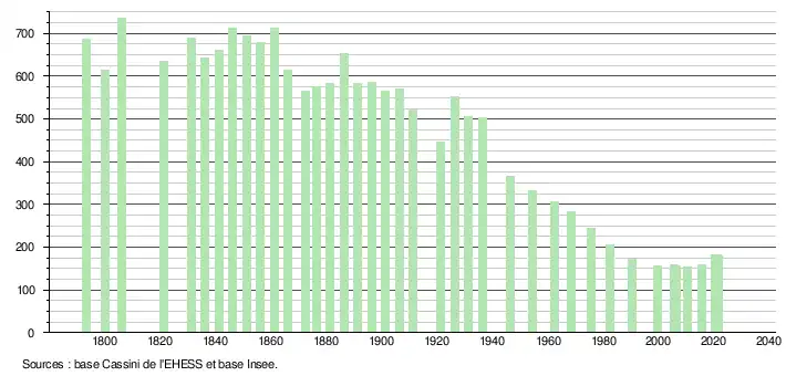 L'évolution du nombre d'habitants est connue à travers les recensements de la population effectués dans la commune depuis 1793. Pour les communes de moins de 10 000 habitants, une enquête de recensement portant sur toute la population est réalisée tous les cinq ans, les populations légales des années intermédiaires étant quant à elles estimées par interpolation ou extrapolation[12]. Pour la commune, le premier recensement exhaustif entrant dans le cadre du nouveau dispositif a été réalisé en 2005[13].