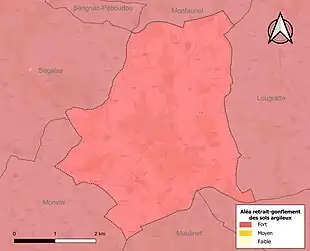 Le retrait-gonflement des sols argileux est susceptible d'engendrer des dommages importants aux bâtiments en cas d’alternance de périodes de sécheresse et de pluie[18]. La totalité de la commune est en aléa moyen ou fort (91,8 % au niveau départemental et 48,5 % au niveau national)[Carte 2]. Depuis le , en application de la loi ELAN, différentes contraintes s'imposent aux vendeurs, maîtres d'ouvrages ou constructeurs de biens situés dans une zone classée en aléa moyen ou fort[Note 2],[19].