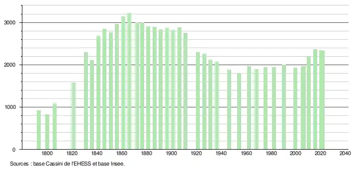 L'évolution du nombre d'habitants est connue à travers les recensements de la population effectués dans la commune depuis 1793. Pour les communes de moins de 10 000 habitants, une enquête de recensement portant sur toute la population est réalisée tous les cinq ans, les populations légales des années intermédiaires étant quant à elles estimées par interpolation ou extrapolation[29]. Pour la commune, le premier recensement exhaustif entrant dans le cadre du nouveau dispositif a été réalisé en 2005[30].