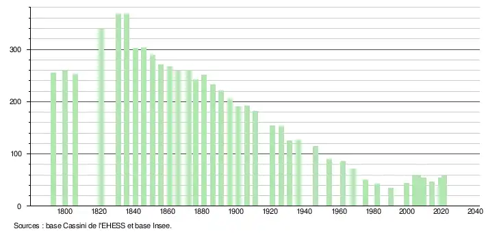 L'évolution du nombre d'habitants est connue à travers les recensements de la population effectués dans la commune depuis 1793. Pour les communes de moins de 10 000 habitants, une enquête de recensement portant sur toute la population est réalisée tous les cinq ans, les populations légales des années intermédiaires étant quant à elles estimées par interpolation ou extrapolation[22]. Pour la commune, le premier recensement exhaustif entrant dans le cadre du nouveau dispositif a été réalisé en 2004[23].