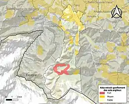 Le retrait-gonflement des sols argileux est susceptible d'engendrer des dommages importants aux bâtiments en cas d’alternance de périodes de sécheresse et de pluie[47]. 23,2 % de la superficie communale est en aléa moyen ou fort (59 % au niveau départemental et 48,5 % au niveau national)[Carte 7]. Depuis le , en application de la loi ELAN, différentes contraintes s'imposent aux vendeurs, maîtres d'ouvrages ou constructeurs de biens situés dans une zone classée en aléa moyen ou fort[Note 9],[48].