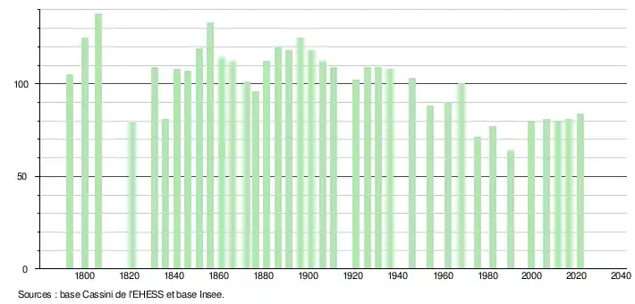 L'évolution du nombre d'habitants est connue à travers les recensements de la population effectués dans la commune depuis 1793. Pour les communes de moins de 10 000 habitants, une enquête de recensement portant sur toute la population est réalisée tous les cinq ans, les populations légales des années intermédiaires étant quant à elles estimées par interpolation ou extrapolation[21]. Pour la commune, le premier recensement exhaustif entrant dans le cadre du nouveau dispositif a été réalisé en 2006[22].