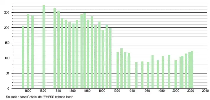 L'évolution du nombre d'habitants est connue à travers les recensements de la population effectués dans la commune depuis 1793. Pour les communes de moins de 10 000 habitants, une enquête de recensement portant sur toute la population est réalisée tous les cinq ans, les populations légales des années intermédiaires étant quant à elles estimées par interpolation ou extrapolation[24]. Pour la commune, le premier recensement exhaustif entrant dans le cadre du nouveau dispositif a été réalisé en 2008[25].
