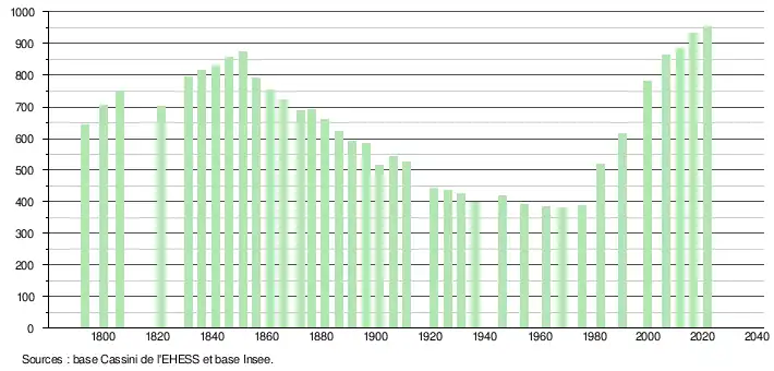 L'évolution du nombre d'habitants est connue à travers les recensements de la population effectués dans la commune depuis 1793. Pour les communes de moins de 10 000 habitants, une enquête de recensement portant sur toute la population est réalisée tous les cinq ans, les populations légales des années intermédiaires étant quant à elles estimées par interpolation ou extrapolation[17]. Pour la commune, le premier recensement exhaustif entrant dans le cadre du nouveau dispositif a été réalisé en 2006[18].