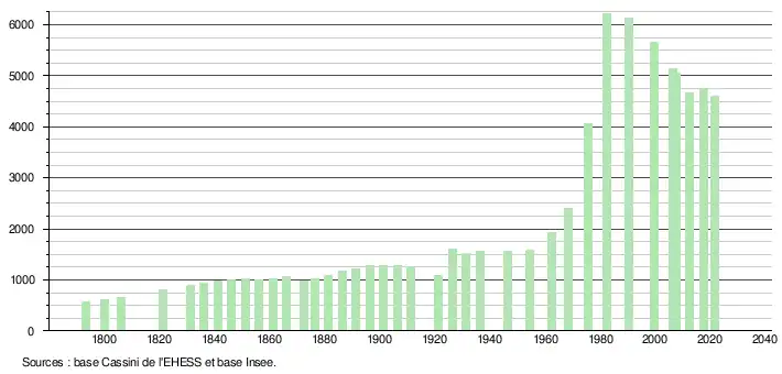 L'évolution du nombre d'habitants est connue à travers les recensements de la population effectués dans la commune depuis 1793. Pour les communes de moins de 10 000 habitants, une enquête de recensement portant sur toute la population est réalisée tous les cinq ans, les populations légales des années intermédiaires étant quant à elles estimées par interpolation ou extrapolation[40]. Pour la commune, le premier recensement exhaustif entrant dans le cadre du nouveau dispositif a été réalisé en 2007[41].