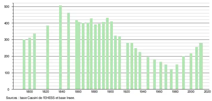L'évolution du nombre d'habitants est connue à travers les recensements de la population effectués dans la commune depuis 1793. À partir du , les populations légales des communes sont publiées annuellement dans le cadre d'un recensement qui repose désormais sur une collecte d'information annuelle, concernant successivement tous les territoires communaux au cours d'une période de cinq ans. Pour les communes de moins de 10 000 habitants, une enquête de recensement portant sur toute la population est réalisée tous les cinq ans, les populations légales des années intermédiaires étant quant à elles estimées par interpolation ou extrapolation[9]. Pour la commune, le premier recensement exhaustif entrant dans le cadre du nouveau dispositif a été réalisé en [10],[Note 1].