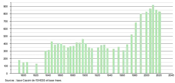 L'évolution du nombre d'habitants est connue à travers les recensements de la population effectués dans la commune depuis 1793. Pour les communes de moins de 10 000 habitants, une enquête de recensement portant sur toute la population est réalisée tous les cinq ans, les populations légales des années intermédiaires étant quant à elles estimées par interpolation ou extrapolation[26]. Pour la commune, le premier recensement exhaustif entrant dans le cadre du nouveau dispositif a été réalisé en 2005[27].