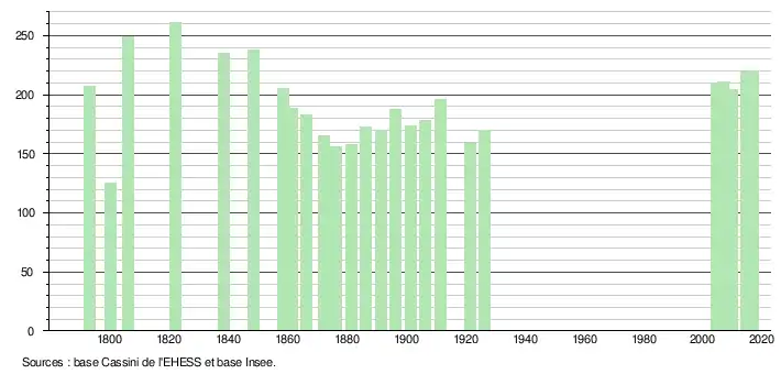 L'évolution du nombre d'habitants est connue à travers les recensements de la population effectués dans la commune depuis 1793. Pour les communes de moins de 10 000 habitants, une enquête de recensement portant sur toute la population est réalisée tous les cinq ans, les populations légales des années intermédiaires étant quant à elles estimées par interpolation ou extrapolation[5]. Pour la commune, le premier recensement exhaustif entrant dans le cadre du nouveau dispositif a été réalisé en 2004[6].