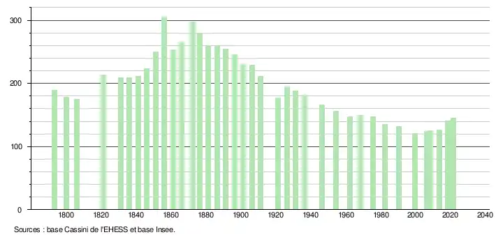 | L'évolution du nombre d'habitants est connue à travers les recensements de la population effectués dans la commune depuis 1793. Pour les communes de moins de 10 000 habitants, une enquête de recensement portant sur toute la population est réalisée tous les cinq ans, les populations légales des années intermédiaires étant quant à elles estimées par interpolation ou extrapolation[26]. Pour la commune, le premier recensement exhaustif entrant dans le cadre du nouveau dispositif a été réalisé en 2008[27]. En 2021, la commune comptait 145 habitants[Note 3], en augmentation de 19,83 % par rapport à 2015 (Haute-Garonne : +7,43 %, France hors Mayotte : +1,84 %). |