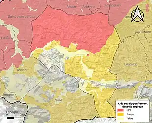 Le retrait-gonflement des sols argileux est susceptible d'engendrer des dommages importants aux bâtiments en cas d’alternance de périodes de sécheresse et de pluie[51]. 81,3 % de la superficie communale est en aléa moyen ou fort (59 % au niveau départemental et 48,5 % au niveau national)[Carte 4]. Depuis le , en application de la loi ELAN, différentes contraintes s'imposent aux vendeurs, maîtres d'ouvrages ou constructeurs de biens situés dans une zone classée en aléa moyen ou fort[Note 8],[52].