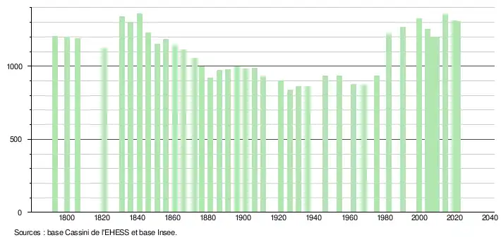 L'évolution du nombre d'habitants est connue à travers les recensements de la population effectués dans la commune depuis 1793. Pour les communes de moins de 10 000 habitants, une enquête de recensement portant sur toute la population est réalisée tous les cinq ans, les populations légales des années intermédiaires étant quant à elles estimées par interpolation ou extrapolation[23]. Pour la commune, le premier recensement exhaustif entrant dans le cadre du nouveau dispositif a été réalisé en 2004[24].