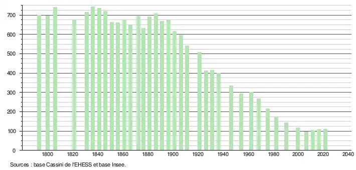 L'évolution du nombre d'habitants est connue à travers les recensements de la population effectués dans la commune depuis 1793. Pour les communes de moins de 10 000 habitants, une enquête de recensement portant sur toute la population est réalisée tous les cinq ans, les populations légales des années intermédiaires étant quant à elles estimées par interpolation ou extrapolation[20]. Pour la commune, le premier recensement exhaustif entrant dans le cadre du nouveau dispositif a été réalisé en 2006[21].