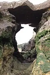 Le littoral est formé pour une grande part d'une alternance de promontoires rocheux (du nord au sud : esplanade du Concié, corniche de Terre-Nègre, corniche du Platin et corniche de Nauzan) et de conches (terme local désignant certains types de plages, de par leur forme incurvée rappelant ces coquillages) de sable fin. Des formations géologiques ciselées par l'érosion marine se distinguent çà et là : les plus célèbres sont le pont du Diable, aux formes torturées, la roche au Moine ou le puits de l'Auture, et peuvent être observées depuis le sentier des Douaniers, véritable balcon sur l'océan. On dénombre quatre conches, qui sont, du nord au sud : la plage du Concié, la plus petite, la plage du Platin, la plage du Bureau[11] (dite aussi de Saint-Palais, et située en centre-ville) et la plage de Nauzan.
